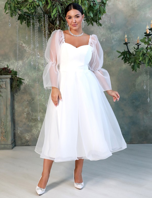Відкрита лінія плечей з органзовими рукавами-буфами, які можна носити як на плечах, так і спущеними.